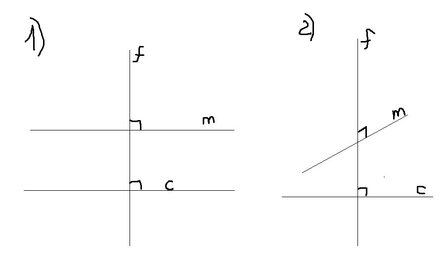 в) если f перпендикулярно c и f перпендикулярно m, то c параллельно m - верно, если прямые находятся в одной плоскости, и неверно, если находятся в разных плоскостях. (Оба случая изображены на картинке)