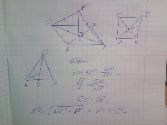 3.Пусть ABCD – квадрат со стороной, равной 2√6, O – точка пересечений его диагоналей, ON – перпендикуляр к плоскости квадрата, ON = 2. Найдите расстояние от точки N до вершины квадрата.