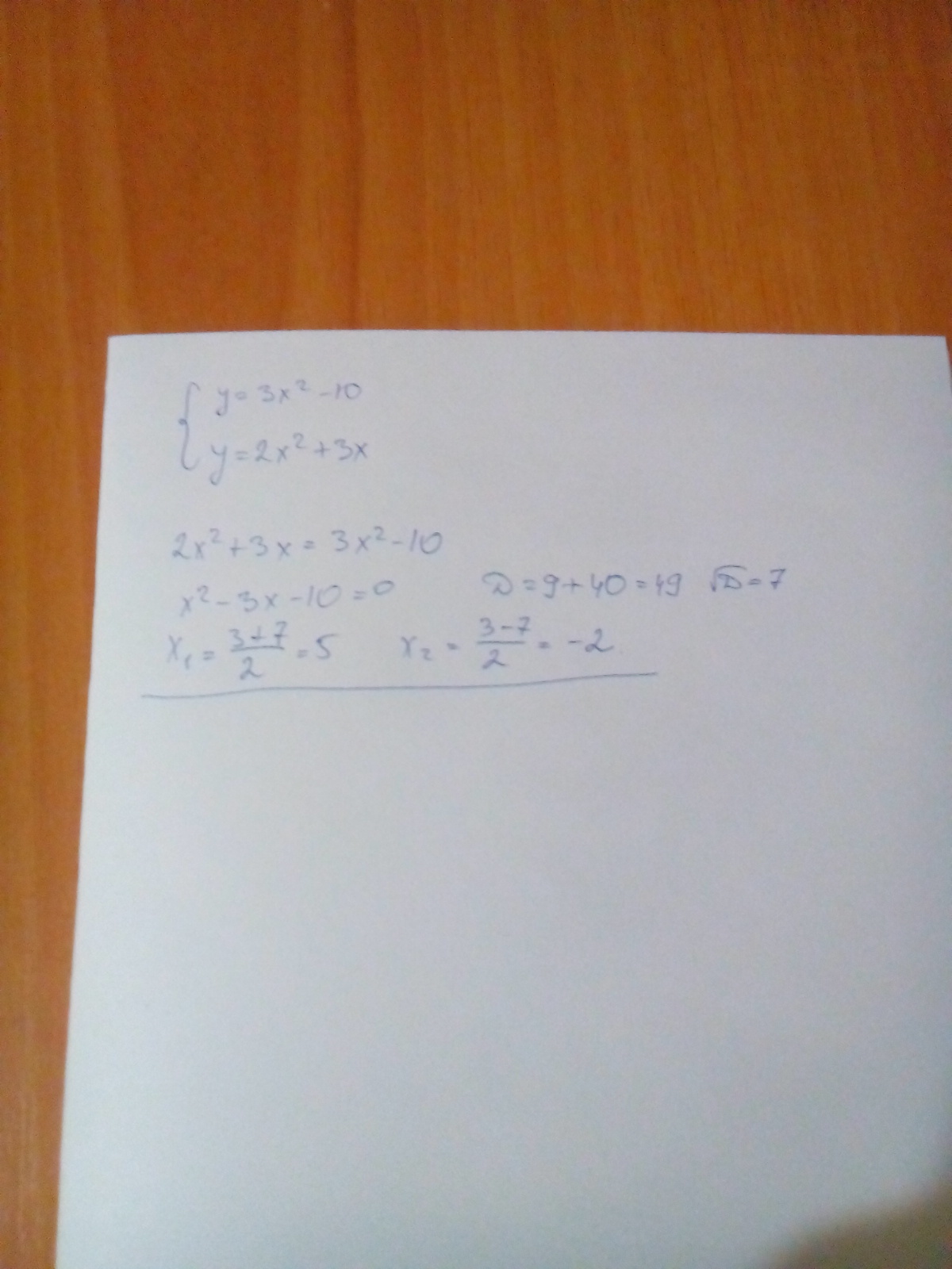 Не выполняя построения найдите координаты точек пересечения параболы y=3x^2-10 и параболы y=2x^2+3x.