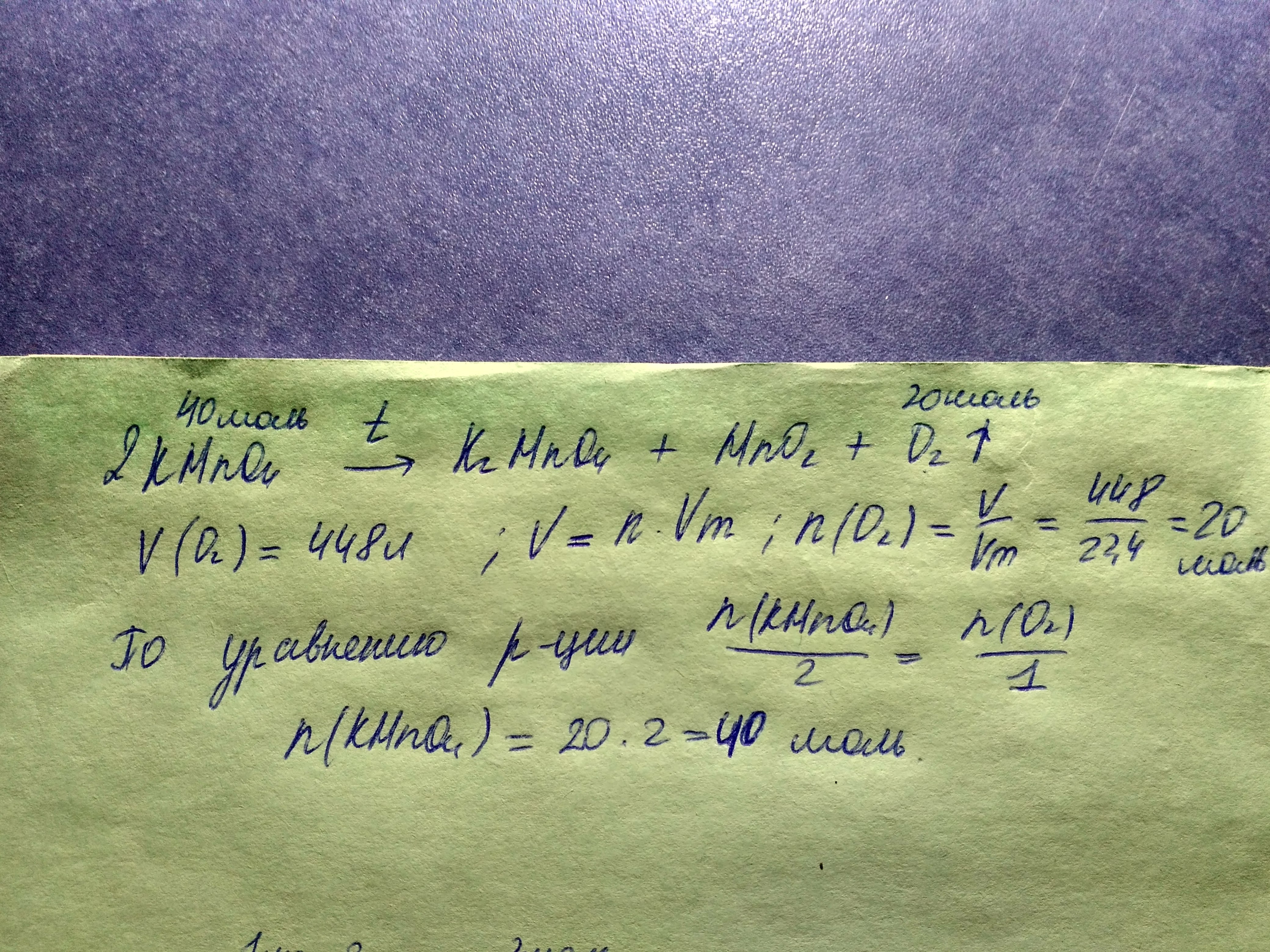 вычислите количество вещества перманганата калия, из которого получен кислород объемом 448 л(н.у)