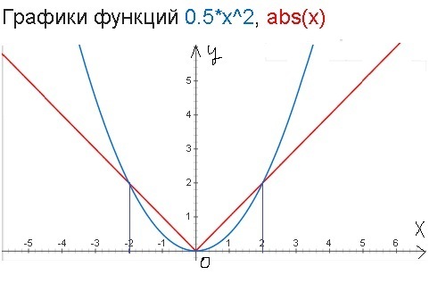 графики пересекаются в точках абсциссы которых являются решениями уравнения х= -2 ; х=2