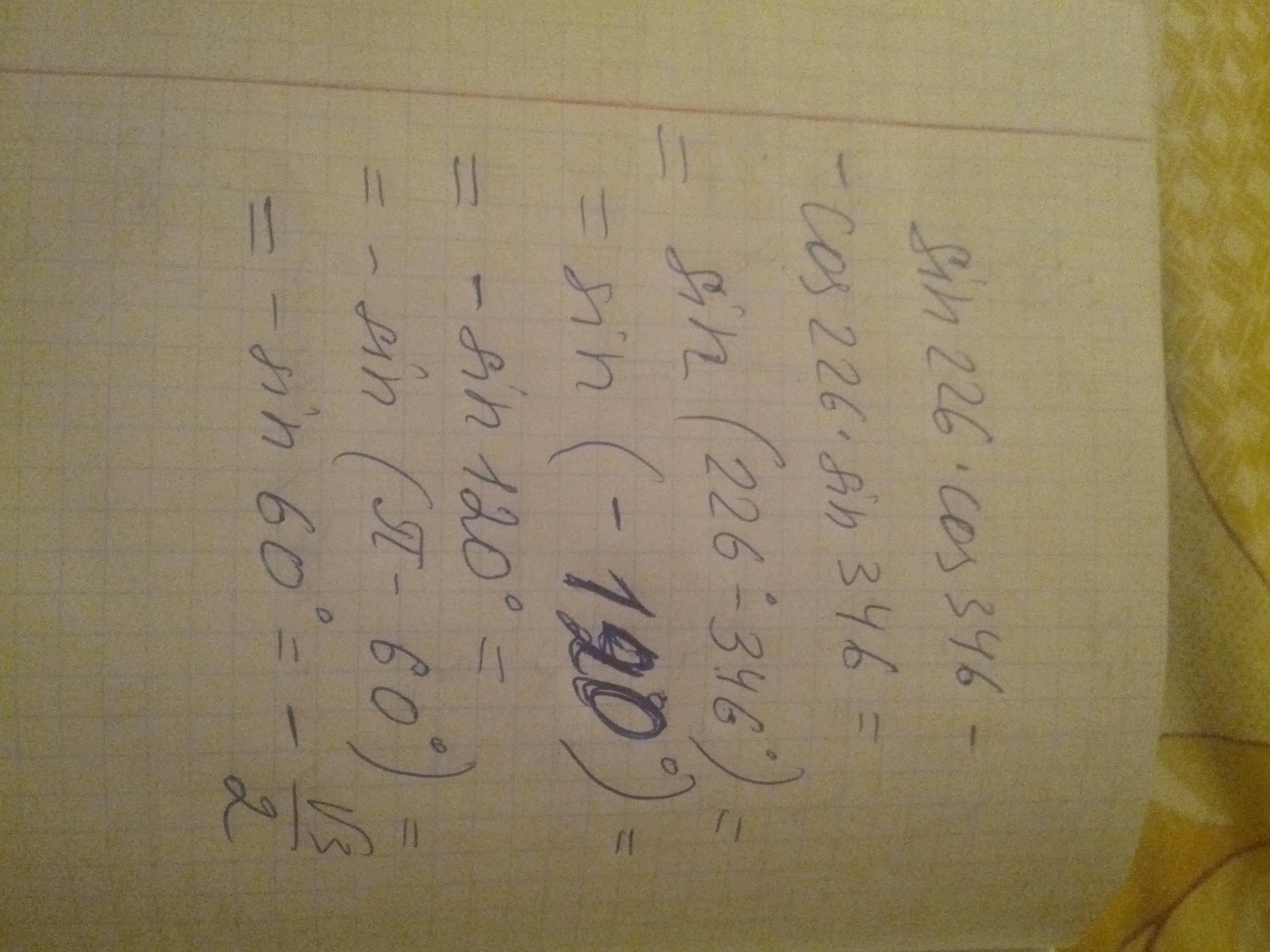 Вычислите sin 226 градусов умножить cos 346 градусов - cos 226 градусов умножить sin 346 градусов