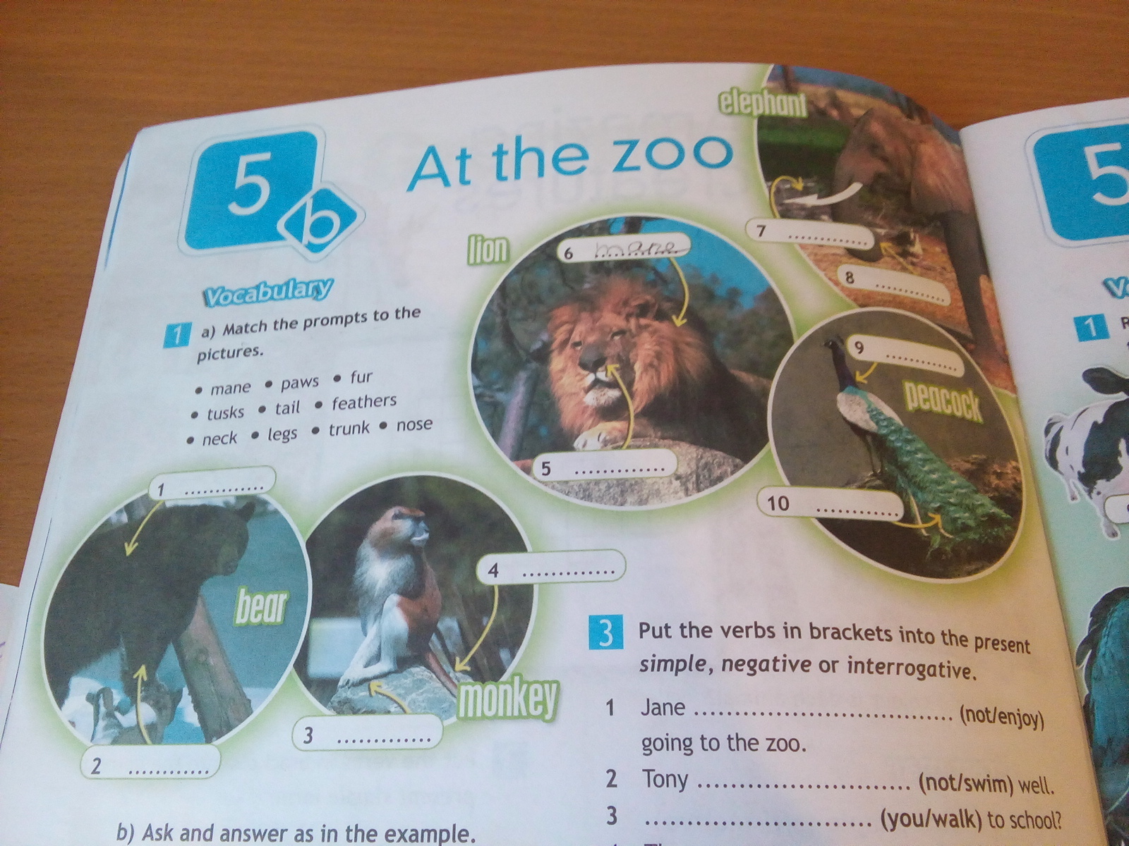Legs (2) tail(4) paws(3) neck(9) nose (5) tusks (7) trunk (8) fur(1) feathers (10)