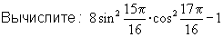 ко второму, буду писать все подробно: 8*sin^2 (pi - pi/16)*cos^2(pi + pi/16) - 1=8*sin^2 (pi/16) * cos^2 (pi/16) - 1=8 * ((1-cos (pi/8)) / 2) * ((1+cos (pi/8)) / 2) - 1 = 2 * (1 - cos (pi/8))(1 + cos (pi/8)) - 1 = 2 * (1- cos^2 (pi /8)) - 1 = 2 - 2cos^2 (pi/8) -1=1 - 2cos^2 (pi/8)= - cos(2*pi/8) = - cos pi/4 = - корень из 2 / 2