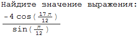к первому: представить 17пи/12 как (3пи/2 - пи/12), получим -4cos(3pi/2 - pi/12) / sin pi/12= 4sin pi/12 / sin pi/12 = 4 (по формулам приведения)