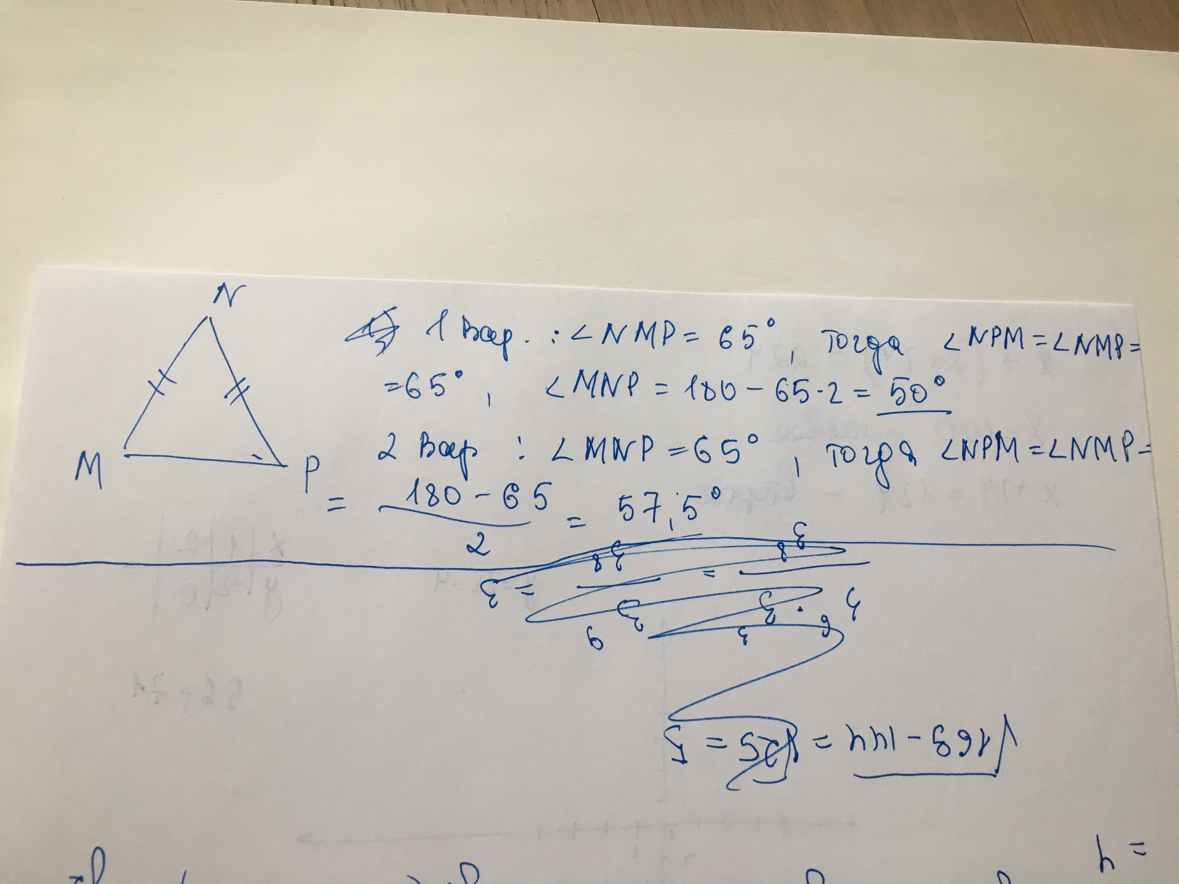 если 65° угол при основании, то тогда получаем углы при основании по 68°, а угол напротив основания 180-65-65=50°