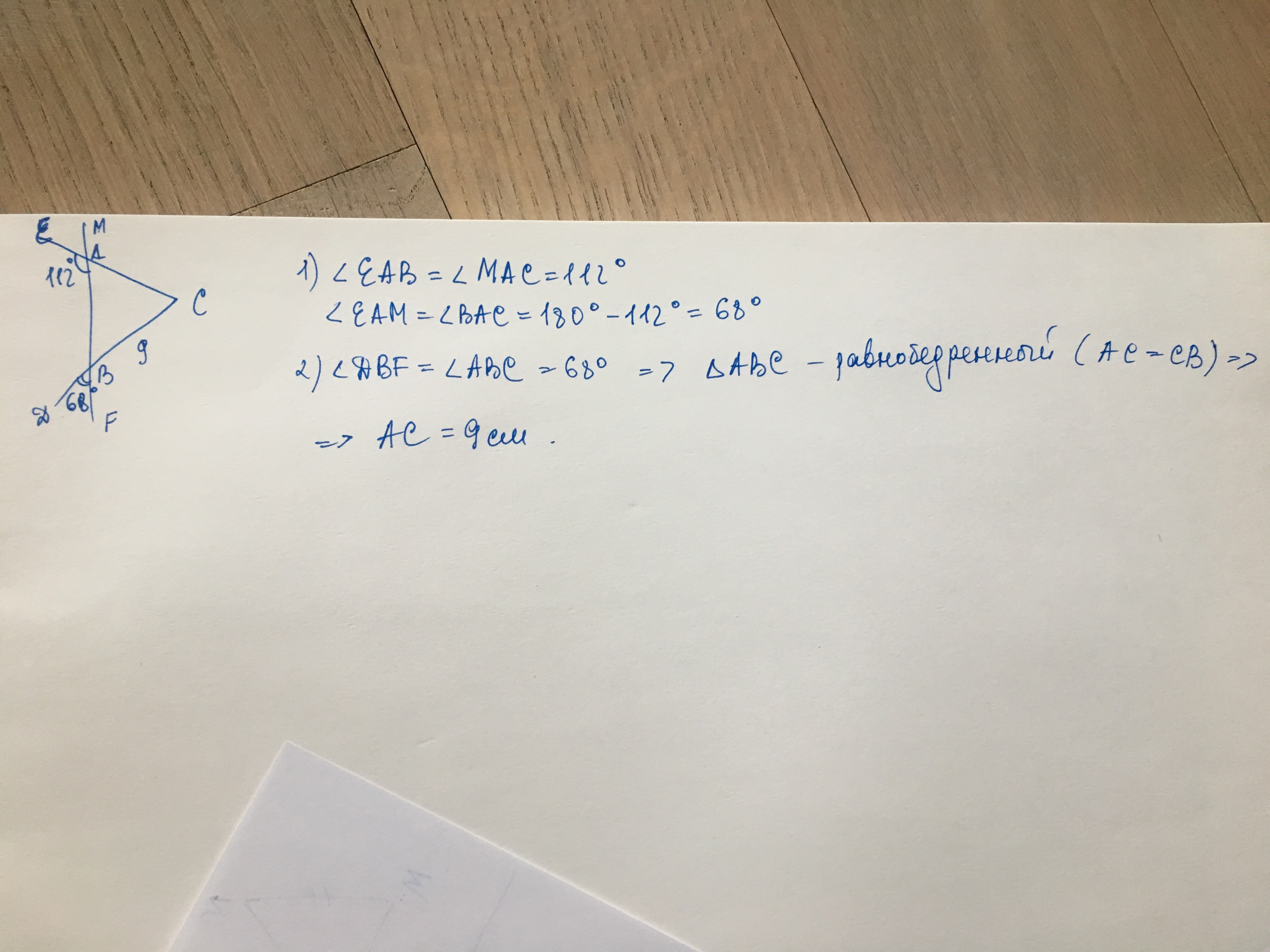 углы САВ и ВАЕ смежные и сумма их равна 180°, следовательно угол СМА=180-112=68°