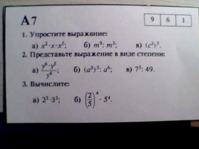 2. a) y^6*y^5/y^4 = y^7 b) (a^3)^5 : a^6 = a^15 : a^6 = a^9 v) 7^5 : 49 = 7^5 : 7^2=7^3