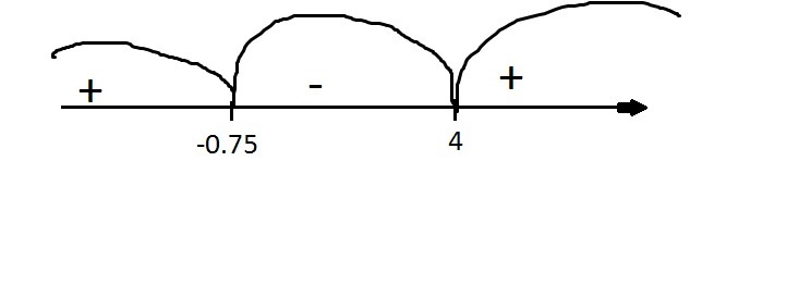 Рисуем числовую прямую, как на рисунке. Отмечает + и - (функция имеет положительные или отрицательные значения при взятии числа из промежутка). Нам нужно в ответ записать только промежуток с -.