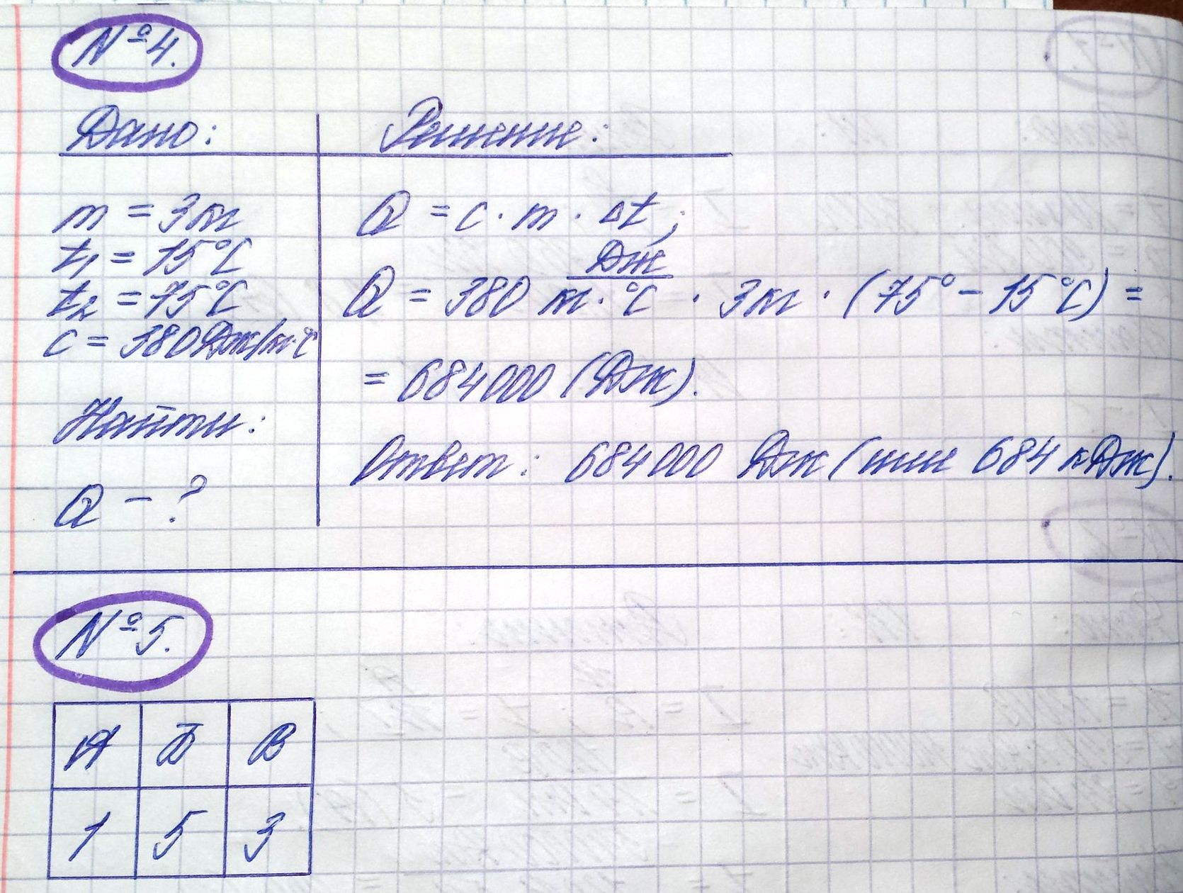 №4. Перед горячей штамповкой латунную болванку массой 3 кг нагрели от 15°C до 75°C. Какое количество теплоты получила болванка? Удельная теплоёмкость латуни 380 Дж / ( кг ⋅ °C).