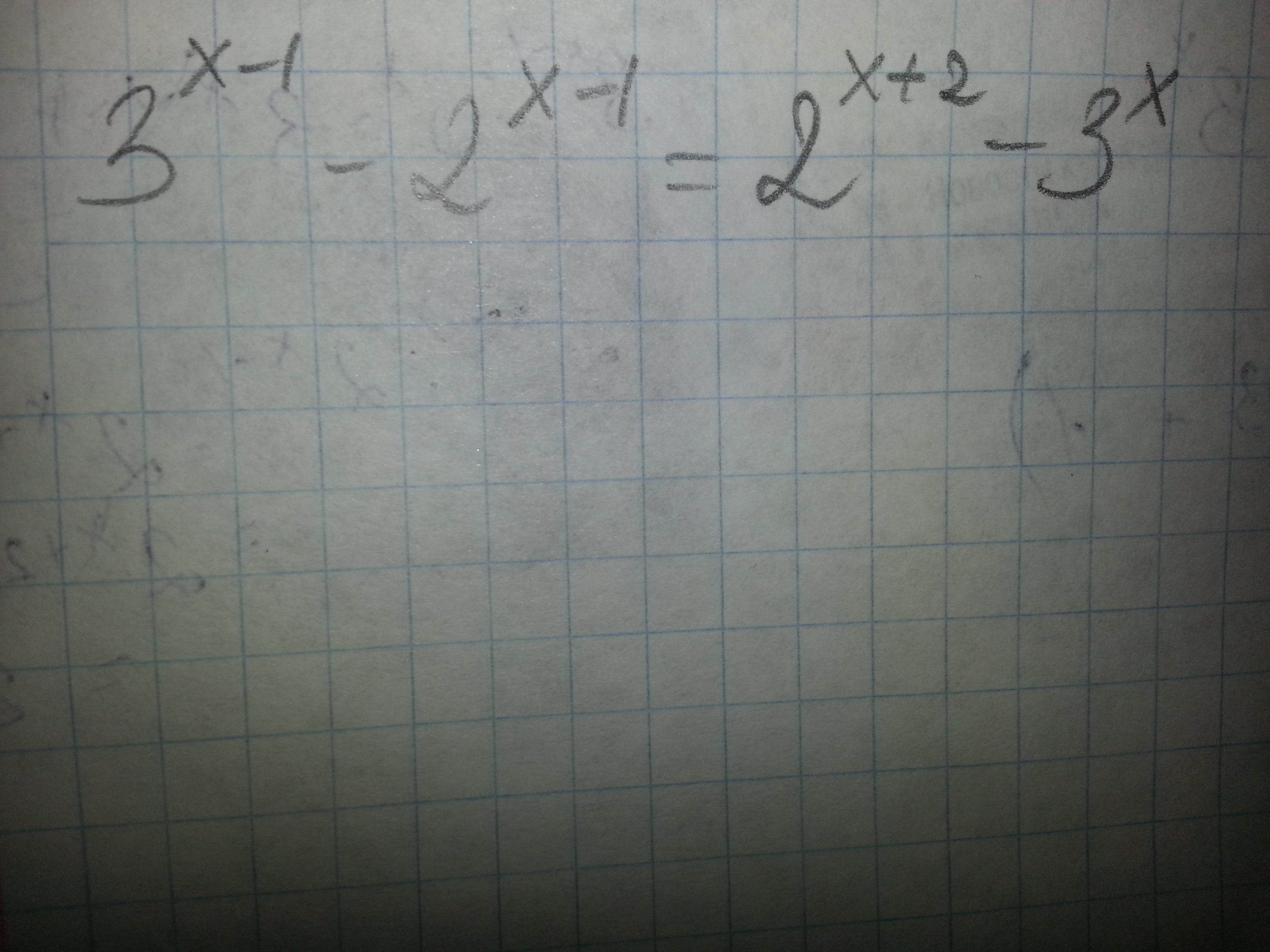 3^{x-1}-2^{x-1}=2^{x+2}-3^x \  1- frac{2}{3}^{x-1}= frac{2^{x+2}}{3^{x-1}}  -3 \ 4=frac{2^{x+2}}{3^{x-1}}+frac{2^{x-1}}{3^{x-1}} \ 2^2=frac{2^{x+2}+2^{x-1}}{3^{x-1}} \ 2^2=frac{2^{x-1}(2^3+1)}{3^{x-1}} \ 2^2= frac{2^{x-1}}{3^{x-1}}*3^2 \   frac{2}{3}^2=frac{2}{3} ^{x-1} \ 2=x-1 \ x=3