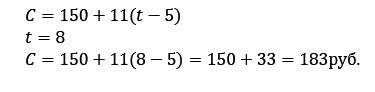 В фирме "Эх прокачу" стоимость поездки на такси(в рублях),длительностью более 5 минут рассчитывается по формуле C=150+11(t-5),где t -длительность поездки выраженная в минутах.Пользуясь этой формулой рассчитайте стоимость 8-и минутной поездки.Ответ дайте в рублях.