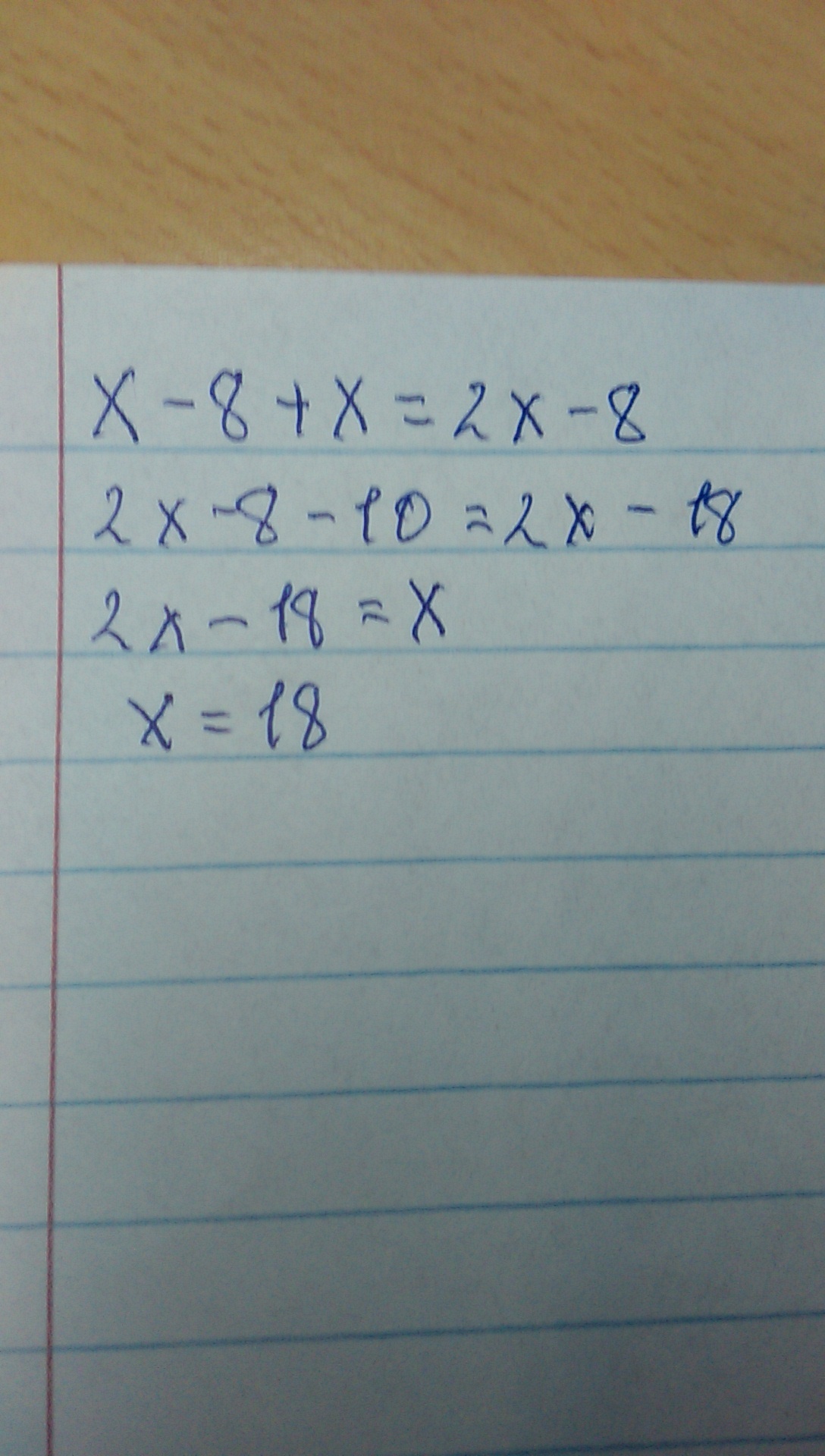 В автобусе было x пассажиров. На первой остановке из автобуса вышли 8 пассажиров, а вошли ровно столько, сколько было изначально. На второй остановке из автобуса вышли 10 пассажиров и не вошло нисколько. В итоге после двух остановок число пассажиров в автобусе равно изначальному до остановок. Выберите уравнение, которое соответствует данной задаче.