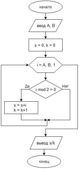 Начертить блок-схему и составить программу, которая вычислит среднее арифметическое четных(или не четных, без разницы) чисел на интервале от A до B включительно.