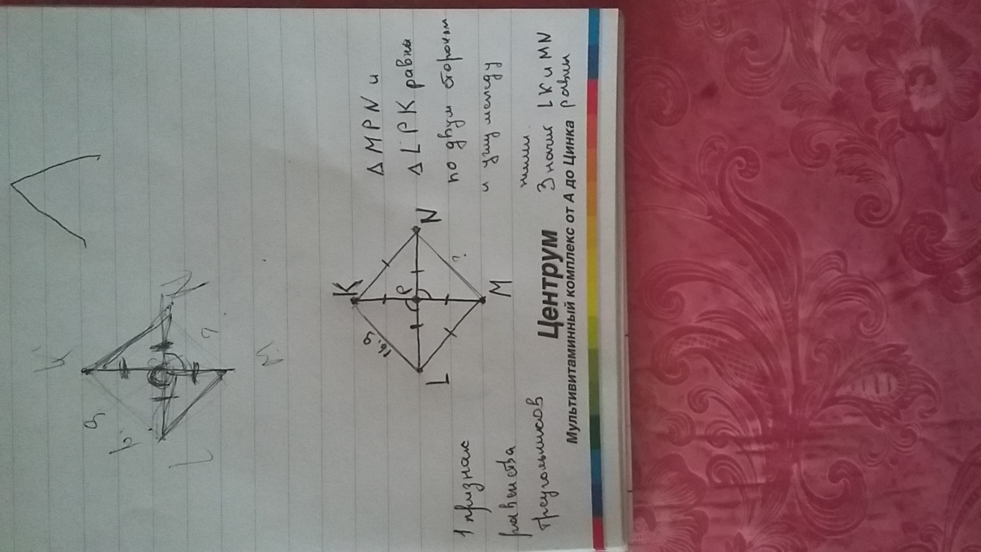 Два перпендикулярных отрезка KMи LN пересекаются в общей серединной точке P и образуют два равных треугольника KPN и MPL.
