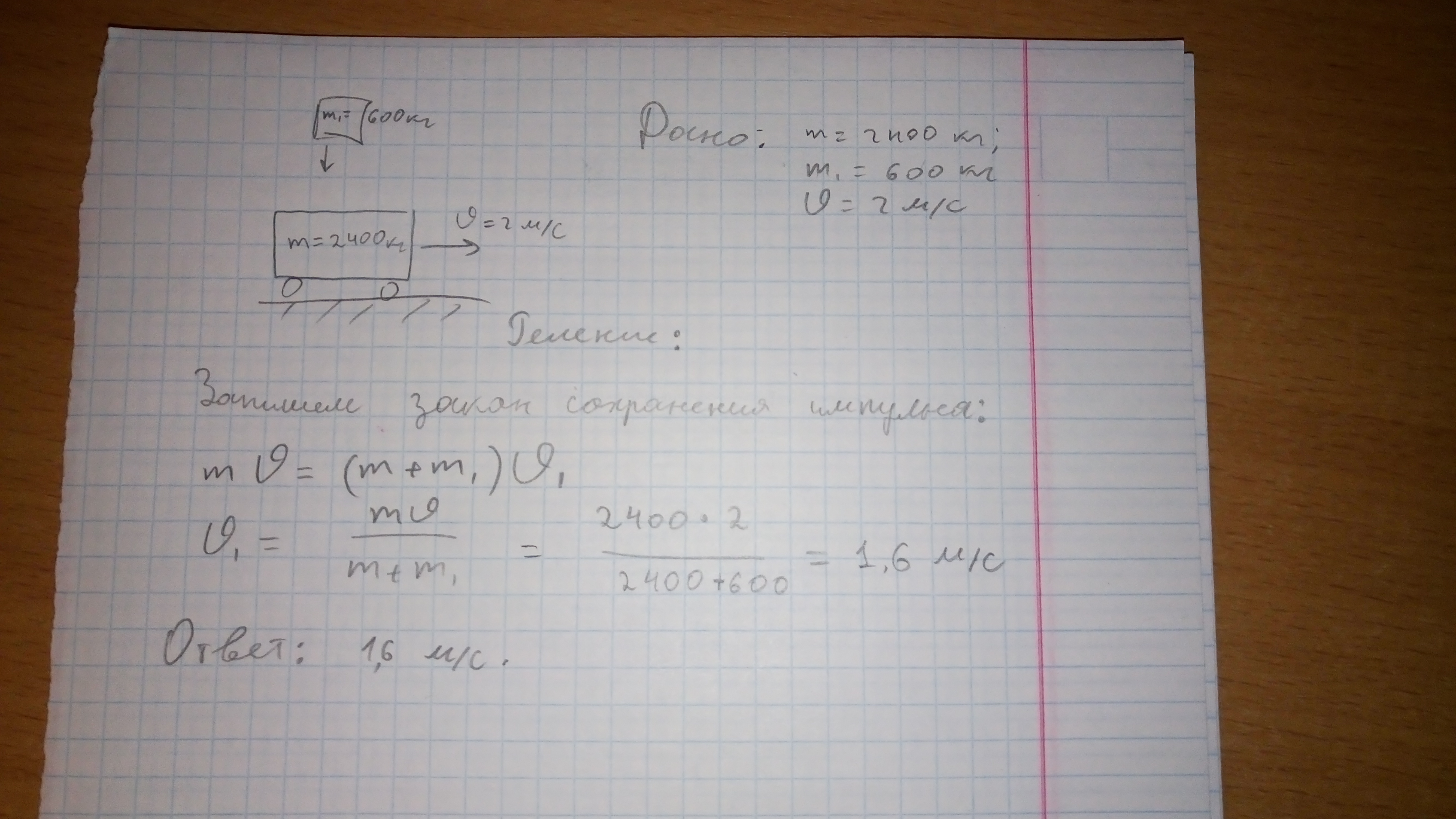 чему будет равна скорость вагонетки массой 2.4т ,движущейся со скоростью 2 мс ,после того как на вагонетку вертикально сбросили 600кг песка
