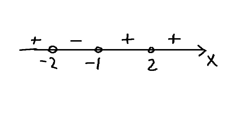 На x∈(-∞;-2)U(-1;2)U(2;+∞) ф-я возрастает, на x∈(-2;-1) ф-я убывает.