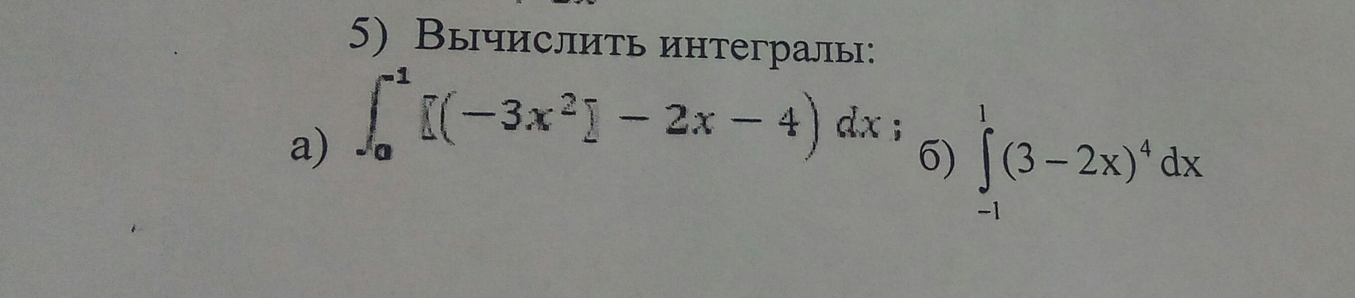 1)quad int (-3x^2-2x-4)dx=-3cdot frac{x^3}{3}-2cdot frac{x^2}{2}-4x+C=\\=-x^3-x^2-4x+C\\2)quad int limits _{-1}^1 , (3-2x)^4dx=- frac{1}{2}cdot frac{(3-2x)^5}{5} , |_{-1}^1=\\=-frac{1}{10}cdot (1^5-5^5)=- frac{1}{10} cdot (1-3125)=frac{3124}{10}=312,4