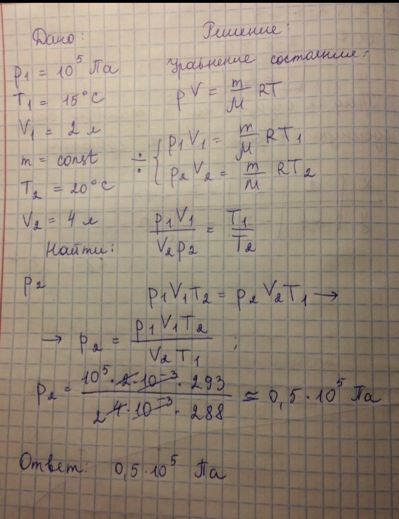 при давлении 10 в степени 5 Па и температуре 15C воздух имеет обьем 2*10 в степени -3 м в кубе.При каком давлении данная масса воздуха займет обьем 4*10 в степени -3 м в кубе,если температура его станет 20C?