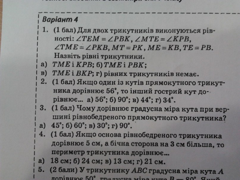3. градусна міра при вершині рівнобедренного трикутника 90 (г)