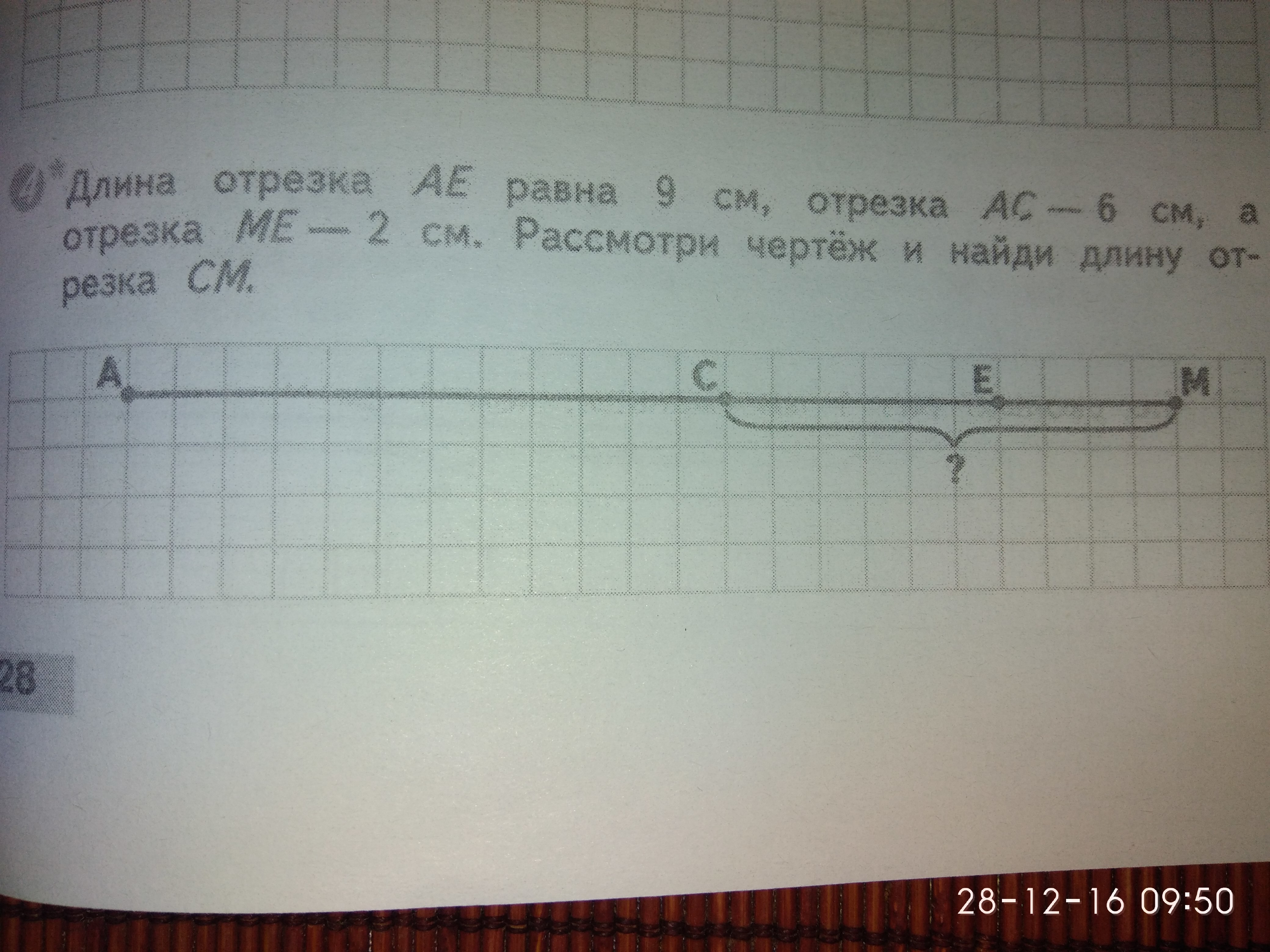 Длина отрезка AE равна 9см, отрезка AC-6см,а отрезка ME-2см. Рассмотрите чертёж и найди длину отрезка CM.