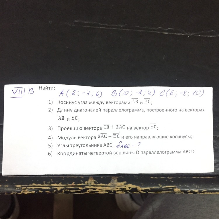 1.АВ=(0-2;-2+4;4-6)=(-2;2;-2) АС=(6-2;-8+4;10-6)=(4;-4;4)