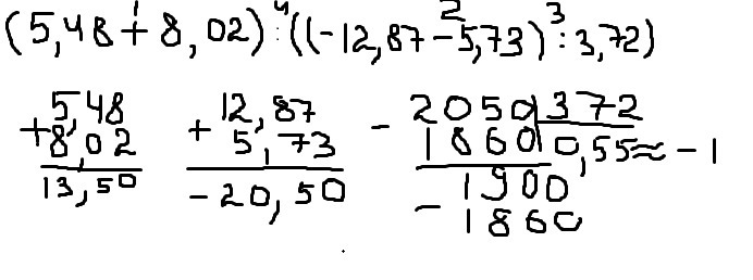 Смотри. Я разделила на 4 действия. Для начала делаем всё,что в скобках и всё,что делится или умножается. Ну, 1 действие я обозначила-это сложение. В итоге получается 13,5, так как ноль мы убираем всегда,если он на окончание и после него нет никаких чисел. Если будет на конце 2 нуля , то убираем два. Второе действие это вычитание отрицательных чисел. Если два минуса , то это тоже самое, как сложение, в итоге получаем -20,5, опять же сокращаем. Третье действие деление. Но там число бесконечное, поэтому округляем до -1, так как минус деля на плюс - получаем -. И 4 действие бессмысленно считать столбиком, так как 13,5 деля на -1- получаем -13,5.