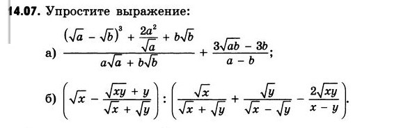 ( sqrt{x} - frac{ sqrt{xy}+y }{ sqrt{x} + sqrt{y} } ):( frac{ sqrt{x} }{ sqrt{x} + sqrt{y} } + frac{ sqrt{y} }{ sqrt{x} - sqrt{y} } - frac{2 sqrt{xy} }{x-y} )= \ =( sqrt{x} - frac{ sqrt{y} ( sqrt{x} + sqrt{y} )}{ sqrt{x} + sqrt{y} } ): frac{ sqrt{x} ( sqrt{x} - sqrt{y} )+ sqrt{y}( sqrt{x} + sqrt{y} )-2 sqrt{xy}  }{x-y} =