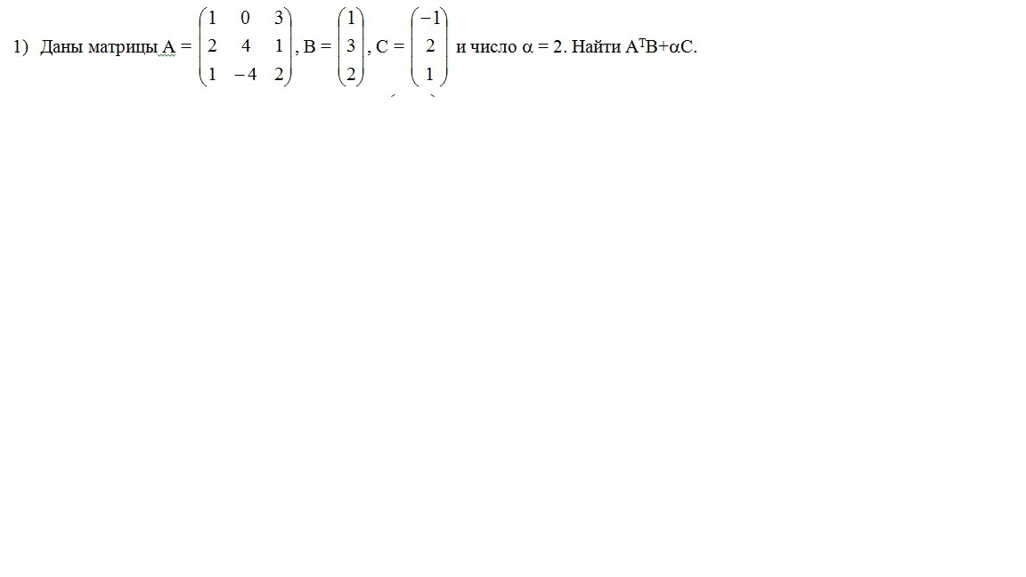 ![A^{T} * B + 2*C =left[begin{array}{ccc}9\4\10end{array}right] + left[begin{array}{ccc}-2\4\2end{array}right] = left[begin{array}{ccc}7\8\12end{array}right] A^{T} * B + 2*C =left[begin{array}{ccc}9\4\10end{array}right] + left[begin{array}{ccc}-2\4\2end{array}right] = left[begin{array}{ccc}7\8\12end{array}right]](https://tex.z-dn.net/?f=A%5E%7BT%7D+%2A+B+%2B+2%2AC+%3Dleft%5Bbegin%7Barray%7D%7Bccc%7D9%5C4%5C10end%7Barray%7Dright%5D+%2B+left%5Bbegin%7Barray%7D%7Bccc%7D-2%5C4%5C2end%7Barray%7Dright%5D+%3D+left%5Bbegin%7Barray%7D%7Bccc%7D7%5C8%5C12end%7Barray%7Dright%5D)