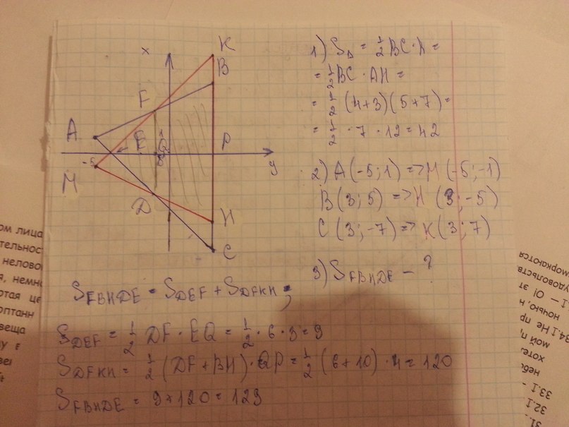 Даны точки на координатной плоскости А(-5;1) В(3;5) С(3;-7) начертите треугольник АВС и вычислите его площадь ; постройте треугольник МНК симметричный треугольнику АВС относительно оси ординат; найдите площадь пересечения треугольников АВС и МНК