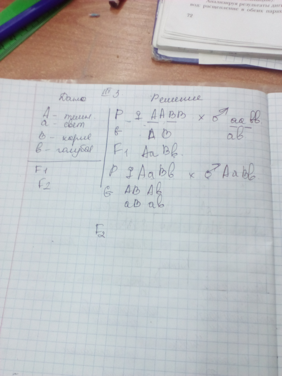 Следовательно, F1 AaBb - темные волосы и карие глаза, так как проявились доминантные гены, а F2 aaBb - светлые волосы и карие глаза, так как проявился рецессивный признак цвета волос, но доминантный признак цвета глаз.