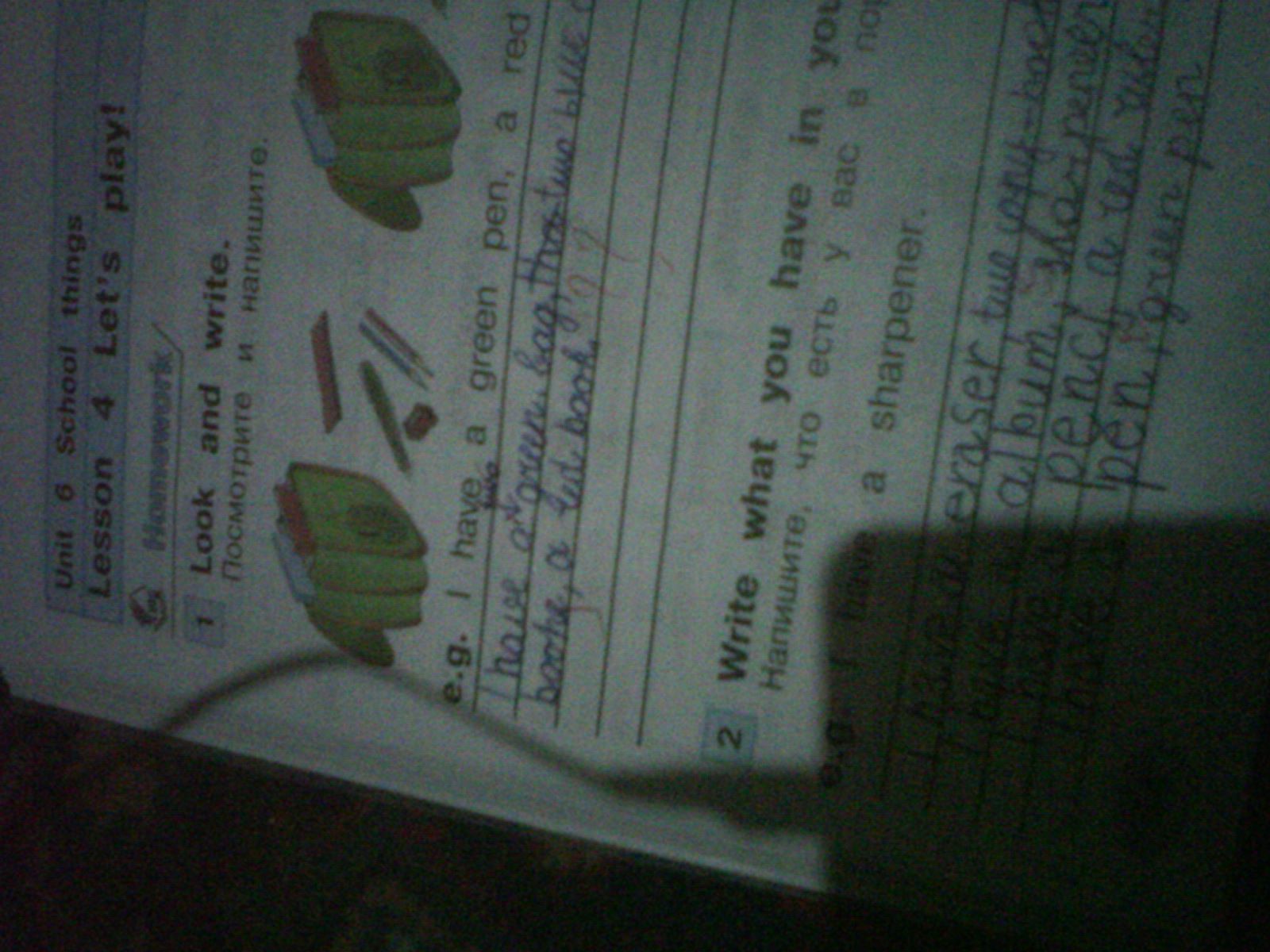 I have a green bag with 2 exercisec books there, also near bag i have one pen and 2 pencils red and blue, alslo i have red ruler and pencil sharpener