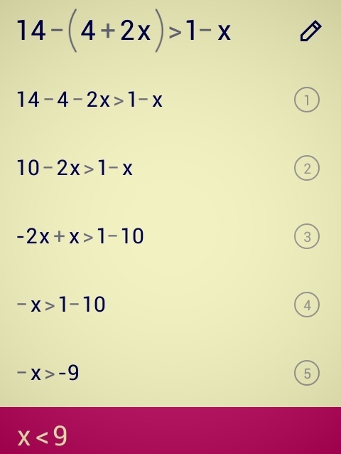 раскрываем скобки: 14-4-2х>1+x