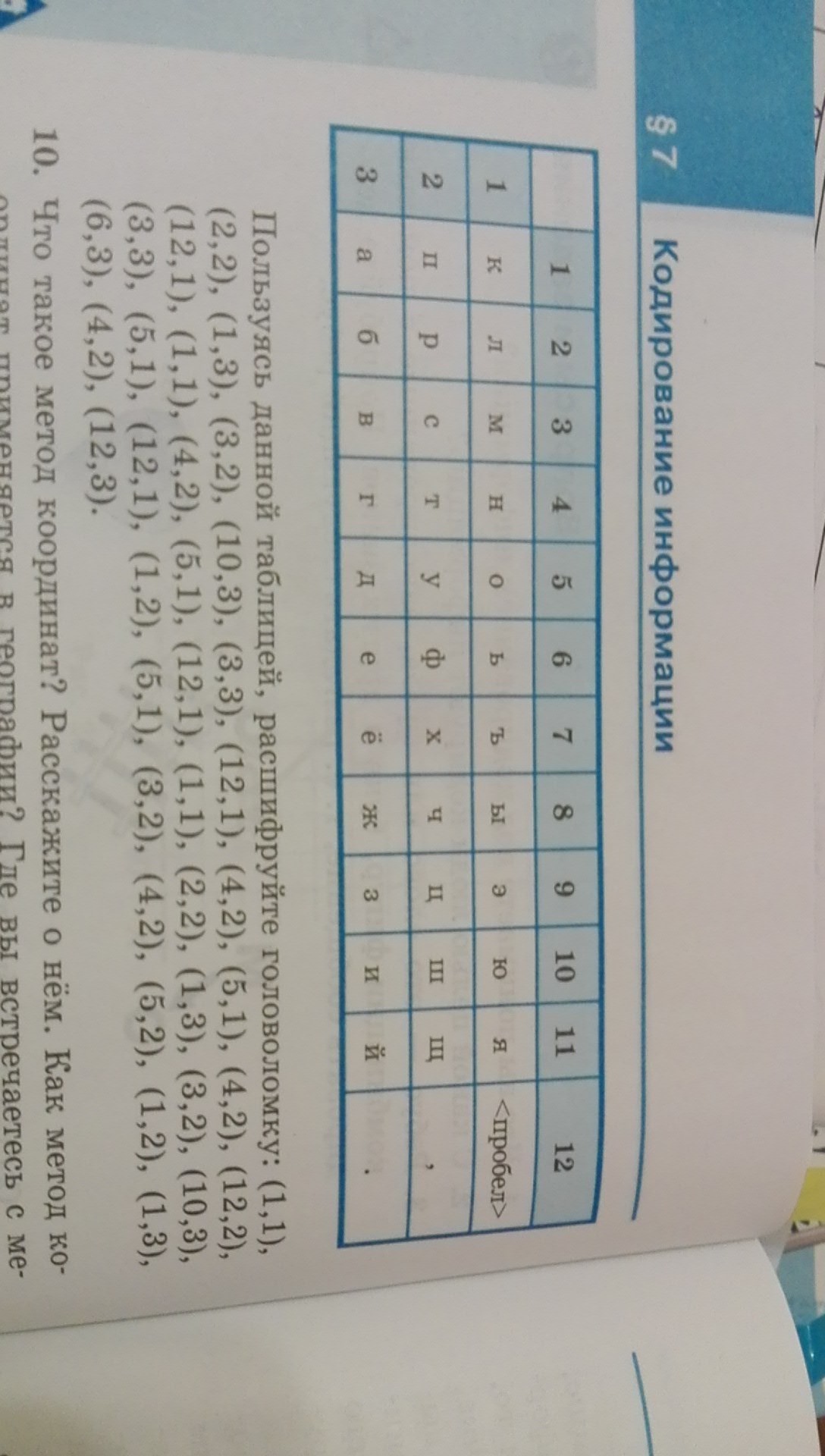 каждой букве алфавита поставлена в соответствие пара чисел первое число номер столбца а второй номер строки следующих кодовой таблицы: