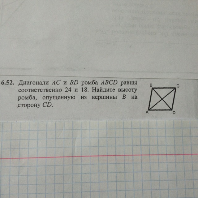 S= 1/2*24*18=216. С другой стороны ромб - это параллелограмм, поэтому его площадь можно найти как произведение основания на высоту. Проведем высоту из точки В к стороне CD, назовем её ВН. Получаем S= ВН*CD =>ВН=S/CD => ВН=216/15=14,4
