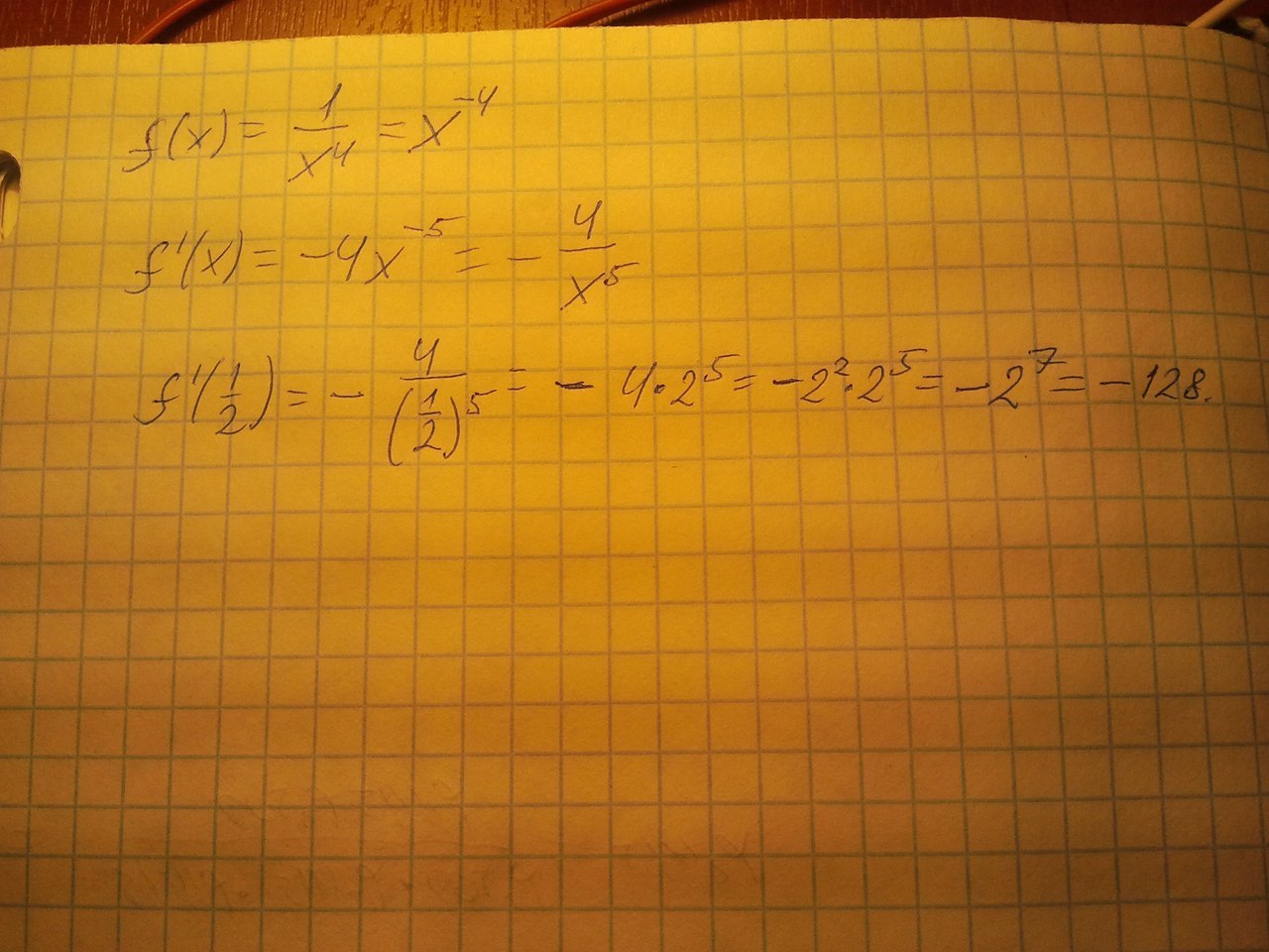 дальше по обычным правилам дифференцирования находим производную: f'(x) = (x^(-4))' = -4*x^(-4-1) = -4*x^(-5)