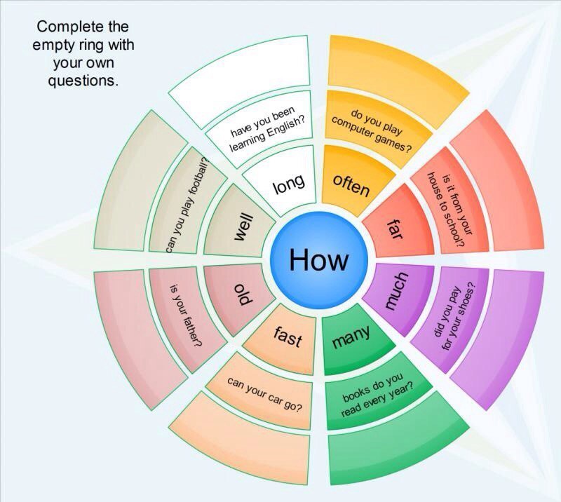 Вам нужно поставить наречение HOW в начало каждого вопроса. Затем слово из маленького круга, а потом из среднего. Времена и порядок слов не изменятся.