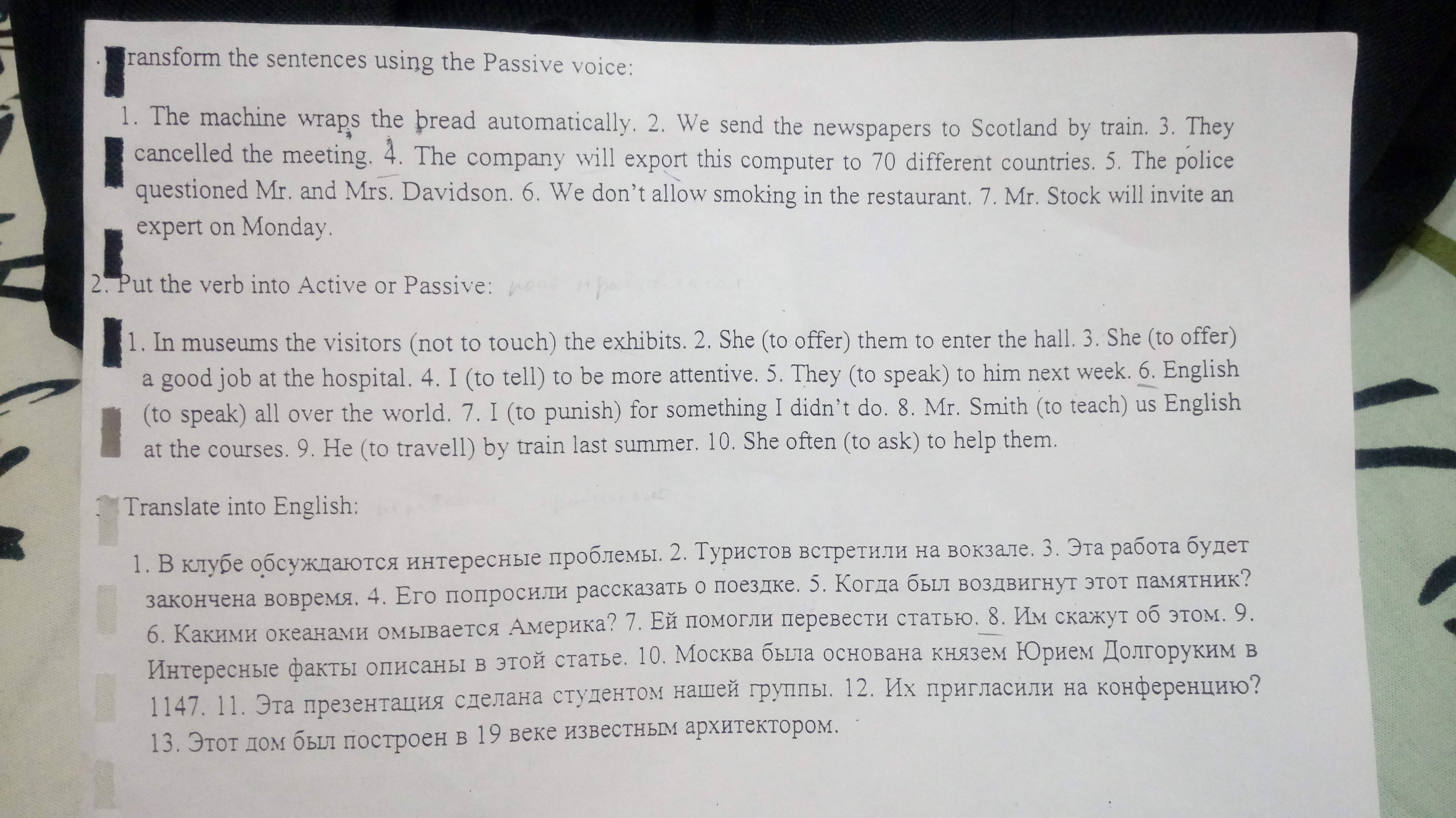 1 Interesting problems are discussed at the club 2 the tourists were met at the railway station 3 he was asked to talk about his trip 5 when was this monument built? 6 Which oceans is America washed by? 7 she was asked to translate the article 8 they will be told about it 9 Interesting facts are described in the article 10 Moscow was founded by Yuri Dolgorukiy in 1147 11 This presentation was made by a student of our group 12 Have they been invited to the conference? 13 the house was built by a famous architect in the nineteenth century.