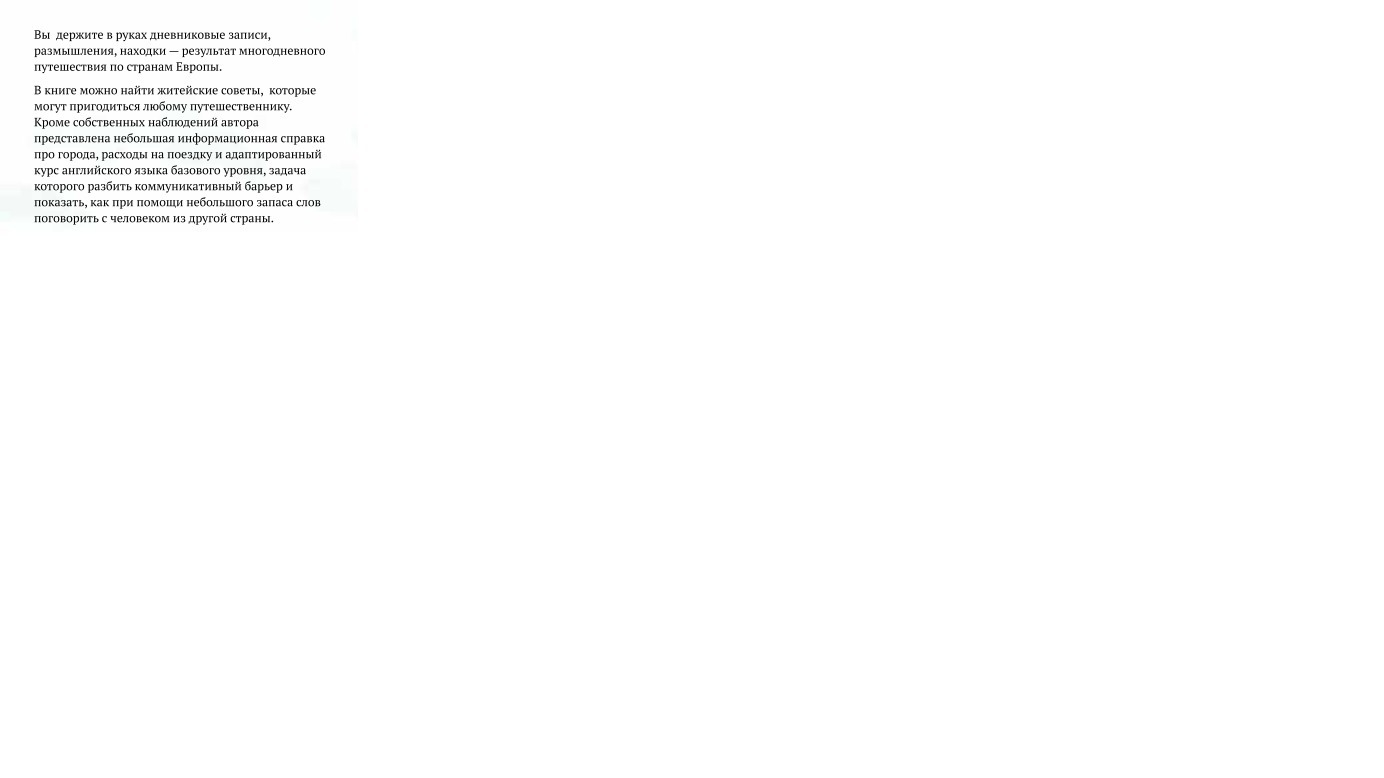 You are holding the diary entries, reflections, discoveries, the result of a multi-day trip to Europe. In the book you can find practical advice that can be useful to any traveler. In addition to the author's own observations represented a small info about the city, travel costs and adapted English course basic level language, whose task is to break the communication barriers and to show how using a small vocabulary to talk to someone from another country.