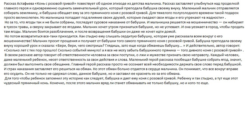 В начале рассказа говорится как все деревенские дети любят пряник"коня с розовой гривой". Далее говорится, что бабушка героя произведения собирается в город, продавать землянику, и она сказала ему, что если он наберет лукошко земляники, она его продаст, и на полученные деньги купит ему этот пряник. Мальчик соглашается, идет с соседскими ребятами в лес по землянику. Но по дороге обратно они съедают практически все ягоды, и соседский мальчишка говорит положить в лукошко траву, а сверху положить оставшийся земляники. Мальчик так и делает, с утра его мучает совесть, и он хочет все рассказать бабушке, но она уже уехала. Когда она вернулась, очень сильно ругала его, и мальчик спрятался. Но приехал дедушка, и посоветовал попросить у бабушки прощения. Мальчик пошел и извинился, бабулка простила его, и вручила пряник.