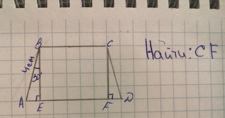 теорема Пифагора ВЕ= под корнем АВ2- АЕ2= под корнем (4*4- 2*2)= под корнем 16-4 =под корнем12= под корнем 4*3= 2 под корнем 3, CF= 2под корнем 3