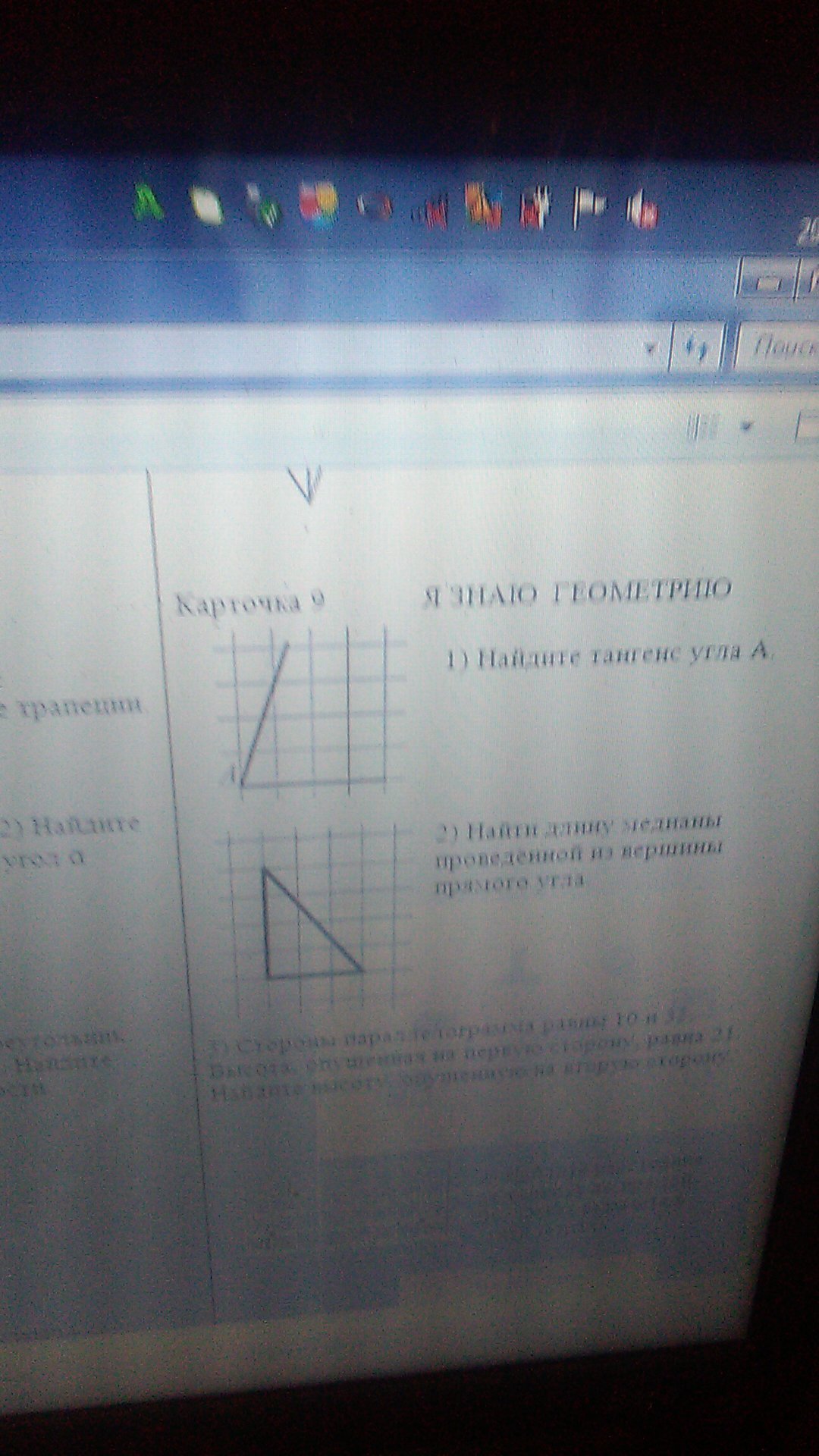 Одна сторона 1 клетка, другая (по вертикали) - 3 клетки. Они образуют угол в 90 градусов. Т.к. тангенс - это отношение противолежащего катета к прилежащему, то тангенс А = 3/1 = 3.