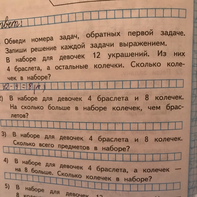 Ответи намира задача обратно в первой задачи запиши запиши решения каждой задачи выражения при наборе для девочек в 12 украшения из них четыре браслета остальные колечки сколько колечек наборе что для девочек четыре браслета и восемь колечек насколько больше в напоре колечек чем
