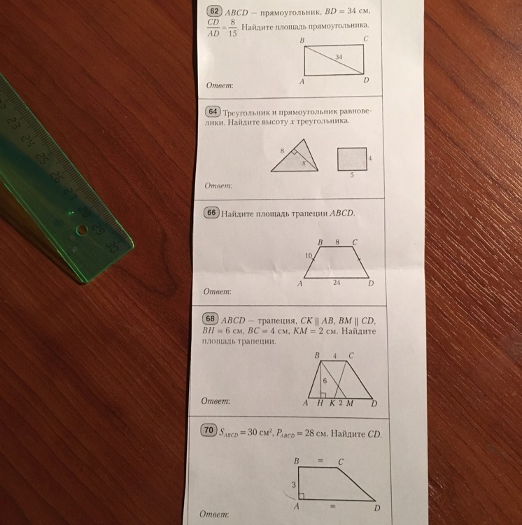 дано: ABCD прямоугольник CD:AD=8:15,AC=34 Найти S Решение Пусть одна часть равна х см, тогда CD=8x см, AD=15x см.По теореме Пифагора АС^ = CD ^ +AD^ , 34^=(8x)^ + (15x)^, 1156=289x^, x^=4, x=2,CD=16, AD=30 S=16*30=480