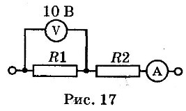 По схеме, изображённой на рисунки 17, определите показания амперметра и общее сопротивление в электрической цепи, если R1=5 Ом, R2=3 Ом.