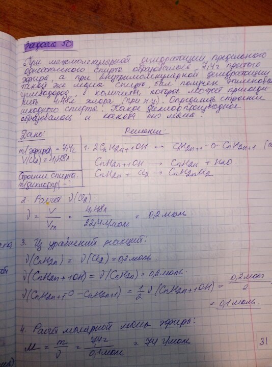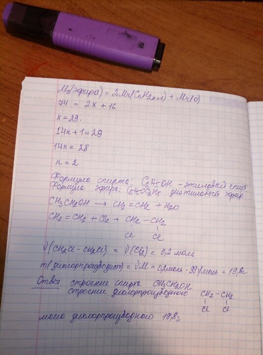 При межмолекулярной дегидратации предельного одноатомного спирта образовалось 7,4 г простого эфира, а при внутримолекулярной дегидратации такой же массы спирта был получен этиленовый углеводород в количестве, которое может присоединить 4,48 л хлора (при н.у.). Определите строение исходного спирта. Какое дихлорпроизводное образовалось и какова его масса?