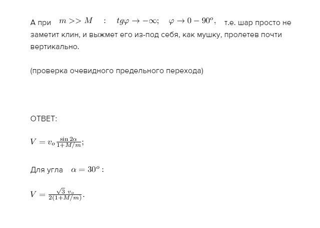 Что бы развеять сомнения, добавлю, что, поскольку мы считаем удар мгновенным, то в тот момент, когда шар УЖЕ оторвётся от верхней поверхности – нижняя поверхность клина ЕЩЁ «не будет знать», что клин уже движется вниз, поскольку сигнал (в виде упругой волны) о верхнем взаимодействии ещё не дойдёт до дна.