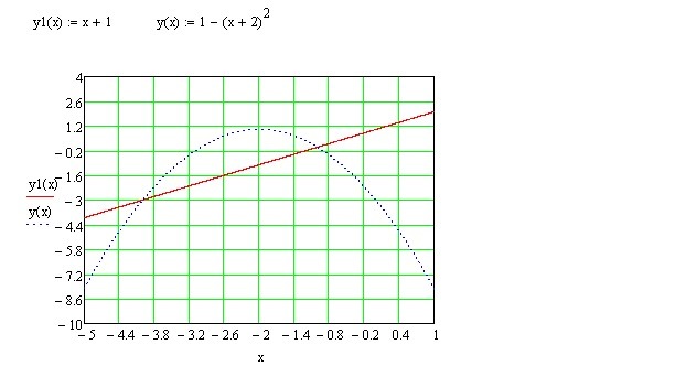 График y=-(х+2)^2+1=-(х²+4*х+4)+1=-(х²)-4*х-3 строим как параболу , вершина хв=4/(-2)=-2; yв= -4+8-3=1. И берём ещё точку левее вершины х3=-3 y3=-9+12-3=0 и точку правее вершины х4=1 y4=-1-4-3=-8. График у=х+1 строим как прямую линию, через точки х1=-1 и y1=-1+1=0 и точку x2=0 y2=1