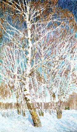 Деревья давно стоят оголенные. Еще осенью они сбросили свои листочки. Стволы берез погрязли в лазурном снегу. Создается впечатление, что снег отражает красоту неба, словно зеркало. На переднем плане деревья более старые, грубые. Если присмотреться, то позади можно увидеть молодые тонкие березки. Картина Грабаря очень светлая, радостная, атмосферная.