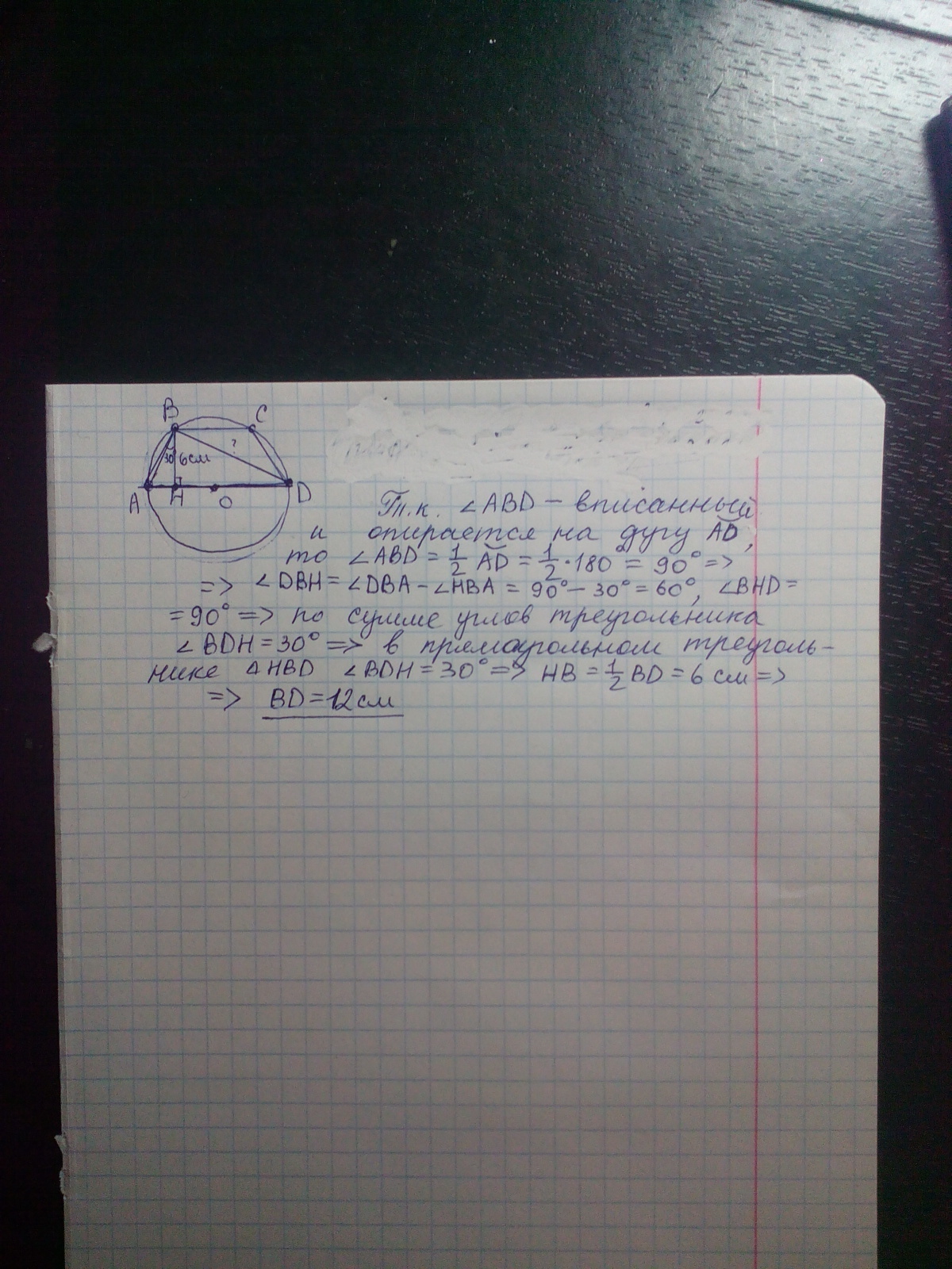 Условие еще раз: Центр окружности описанной около трапеции находится на большем основании длина высоты опущенная из вершины тупого угла равна 6 см и образует с боковой стороной угол 30 .Найдите диагональ трапеции.